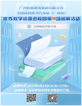 2023年4月18日,2023全国高校教材巡展(广西站)优秀教学资源进校园第10场巡展活动在玉林师范学院学术报告厅门前举办。