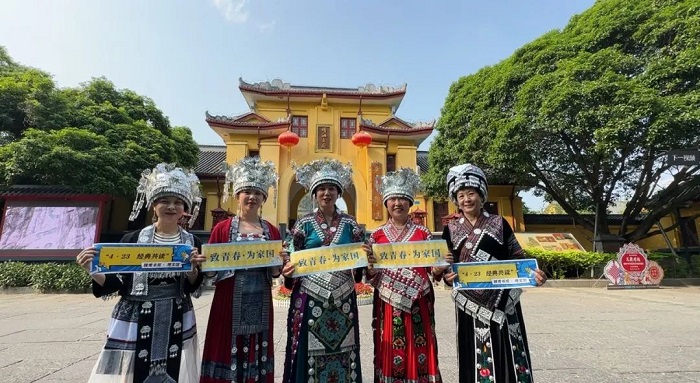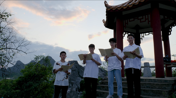 广西师范大学国家语言文字推广基地的成员们头戴银饰,身着广西特色民族服装,在靖江王府用多元化的方式共读经典,寄情于山水,营造了独具广西民族特色的浓厚读书氛围。