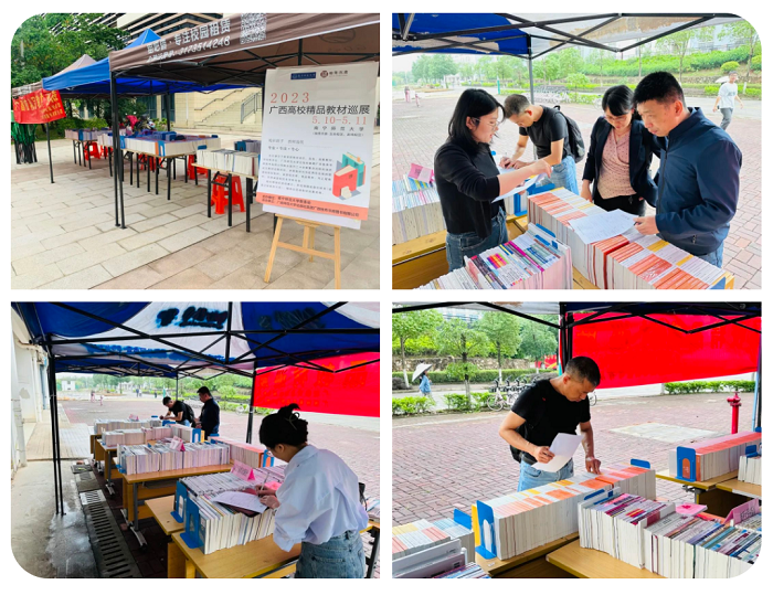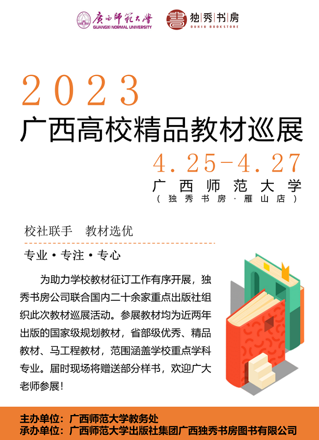 2023年4月12日至6月15日,由广西师范大学出版社集团广西独秀书房图书有限公司(以下简称“独秀书房公司”)联合国内30余家知名出版机构在广西区内13所高校开展了为期63天的“2023年广西高校精品教材巡展”,参展教师逾千人,参展教材均为近两年出版的国家级规划教材,省部级优秀、精品教材、马工程教材,范围涵盖学校的重点学科专业,为高校的教材征订工作提供了直观、简单的运作模式。
