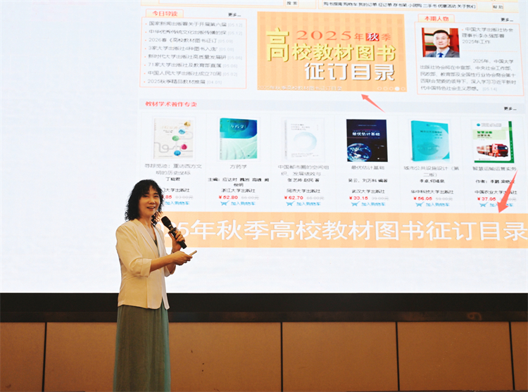 浑燕珍做了中国高校教材图书网和《高校教材图书征订目录》纸质版和网络版介绍,她说,中国高校教材图书网是教育部和中国大学出版社协会指导,百家大学出版社合力共建,中国人民大学出版社承建和管理的全国高校出版社公共门户网站,是集信息宣传、电子政务、电子商务于一体的多功能网络平台。她还从七大方面介绍了《高校教材图书征订目录》的历史背景、特点和优势。