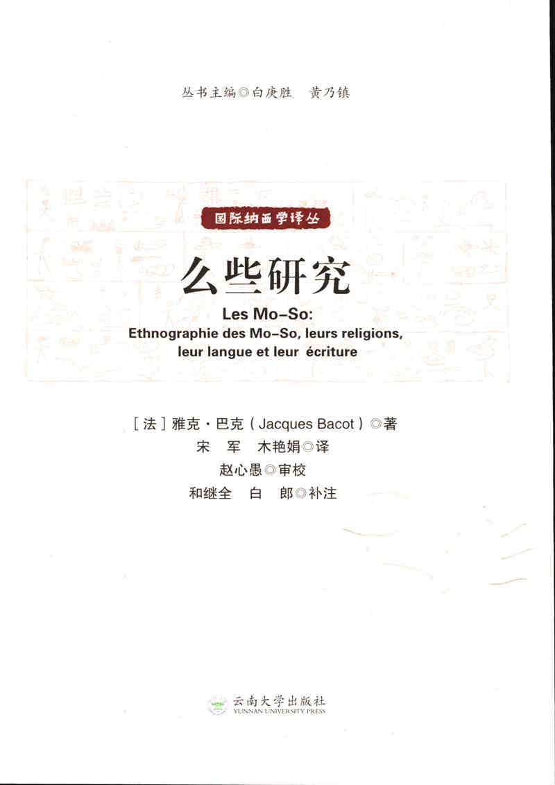 雅克·巴克(Jacques Bacot,1877—1965),20世纪初法国地理学家、语言学家、民族学家、藏学家,尤以其藏学研究见长。曾供职于法国高等研究应用学院,担任亚洲学会会长(1945—1954)。 宋军,1964年生。本科毕业于西安外国语大学,硕士毕业于法国马赛一大艾克斯文学院文学艺术系。1990年9月至今,在西南民族大学文学与新闻传播学院任教师,教授“外国文学史”“外国文化通论”“外国名著鉴赏”及“基础法语”等课程。已发表外国文学评论、译作及教学研究文章30余篇。 木艳娟,1981年生,云南丽江人,现于西南民族大学攻读博士学位。2006年起任教于西南民族大学外国语学院法语系,教授“高级法语”“法语口译”等课程,主持的教学改革项目获国家民族事务委员会“优秀奖”。多次在重要活动中担任法语翻译。2016年获国家留学基金委西南民族大学青年骨干教师项目支持,并赴法国国家科学院口传语言与文化研究所访学。主持教育部人文社会科学研究项目“法国馆藏纳西族典籍整理、翻译与研究”(2017年立项)。