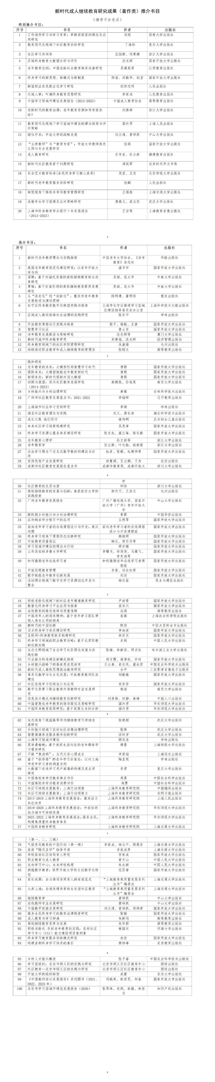 据了解,共有74家单位报送了177种图书,汇集了近6年成人继续教育领域内的优秀学术成果。经专家组审定,《老年教育论纲:中国老龄社会教育体系完善研究》等20种图书被作为特别推介书目,《新时代老年教育理论与实践探索》等100种图书被作为推介书目。