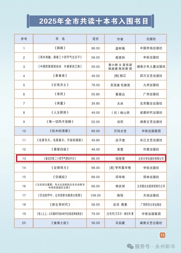 此外,钱乘旦的《风起云飞扬:钱乘旦讲大国崛起》入选福建省5月领导干部阅读推荐书单,冯天瑜、周积明合著的《中国文化简史》入选湖北宜昌市委宣传部推荐书单,阎海军的《崖边农事:二十四节气里的村庄》受到中共永州市委宣传部的推荐,曹林的《时评中国5》和陈立的《跟着音乐大师去旅行》同时入选广州新华发行有限公司2025年第一季畅销图书推荐名单。
