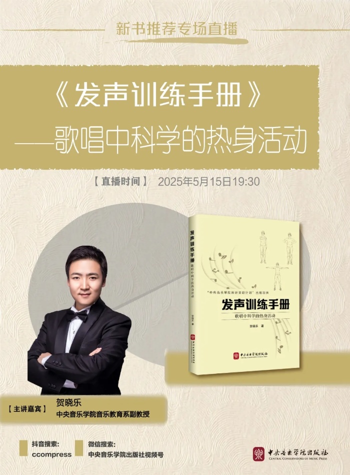 5月15日(周四)晚19:30,中央音乐学院音乐教育系贺晓乐副教授将作客中央音乐学院出版社直播间,带来《发声训练手册》——歌唱中科学的热身活动新书推荐专场直播!