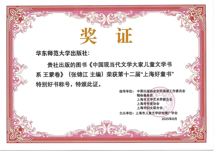 由华东师范大学出版社出版的《中国现当代文学大家儿童文学书系·王蒙卷》荣膺第十二届“上海好童书”特别好书,《新说山海经系列绘本·青燕》入选第十二届“上海好童书”,《大宋群英传·杨家将传奇》入围第十二届“上海好童书”。