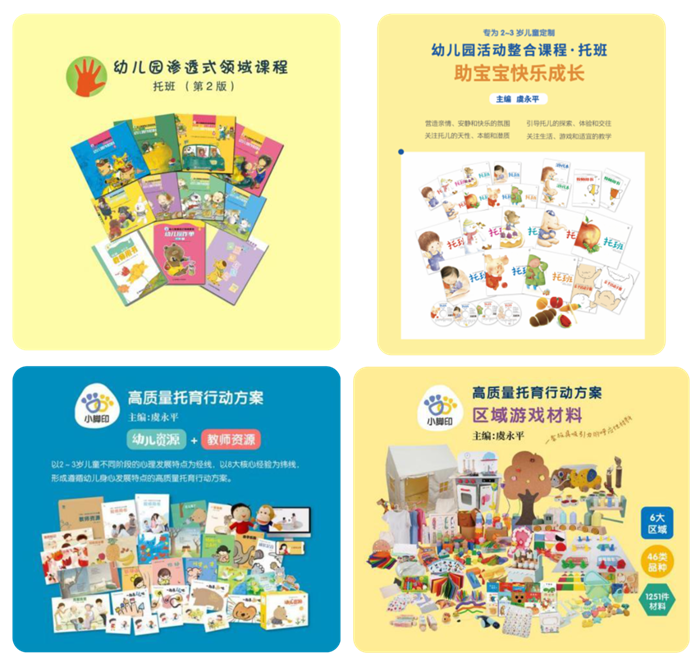 近年来,在南京师范大学虞永平教授带领下,南师出版又率先对托班课程资源全新升级,推出《小脚印·高质量托育行动方案》及区域游戏材料。其核心目标是为托育行业提供专业、系统、可操作的资源支持,助力托育机构提升保教质量。致力于打造真正适合中国婴幼儿发展特点和本土文化背景的科学托育方案。