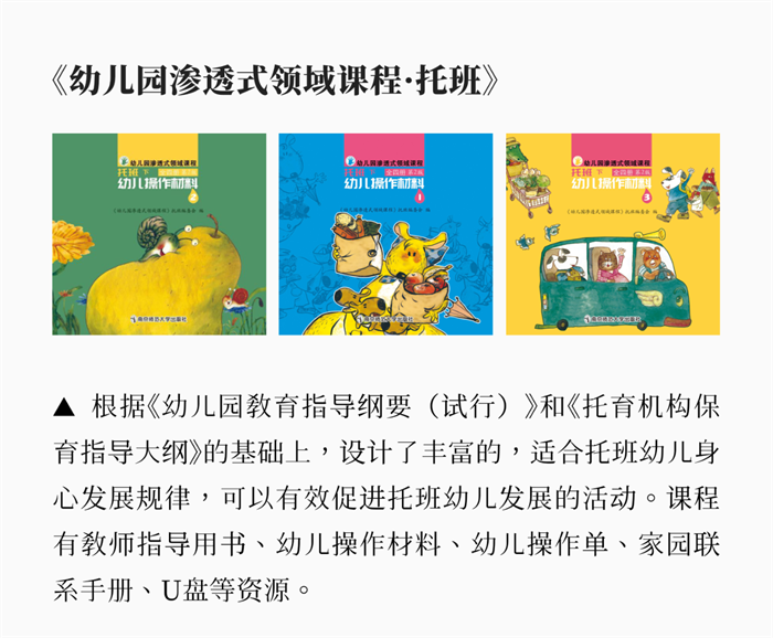 0-3岁托育课程的开发,是教育领域公认的难点。它看似浅显,实则对儿童发展规律的理解、活动设计的生活性与游戏性要求极高。针对国内高质量托育资源相对匮乏、本土化体系尚需完善的现状,南师出版充分发挥其教育研究和出版优势,整合脑科学、心理学、教育学等多学科前沿成果,并吸收国际先进经验,历经二十余年的持续研究与积淀,推出了系列优质托育资源,如《幼儿园渗透式领域课程·托班》《幼儿园活动整合课程·托班》。