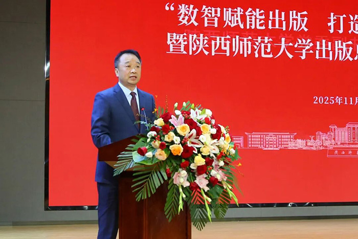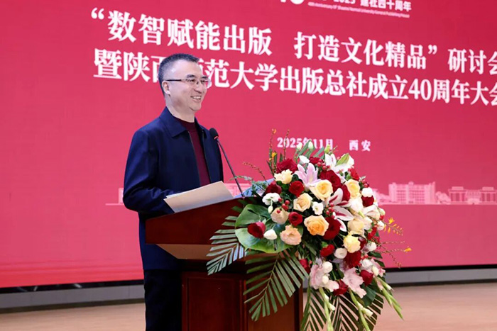 陕西师范大学校长游旭群致辞。他谈到总社40年风雨兼程的成长史,是一部与改革开放同频共振的奋斗史,是一部服务国家科教兴国与教育强国、文化传承创新与文化强国建设的奉献史,也是一部与学校休戚与共、相得益彰的发展史。总社始终坚持正确出版导向,坚守文化责任,深化改革创新,影响力、竞争力和服务能力持续提升,走出了一条独具特色的大学出版之路。希望总社以40年社庆为契机,承前启后,继往开来,植根博大精深的中华文明,顺应信息技术发展潮流,深刻把握数智时代的历史机遇,自觉担当新的文化使命,在坚守中创新,在融合中发展,更好服务文化强国、教育强国建设。