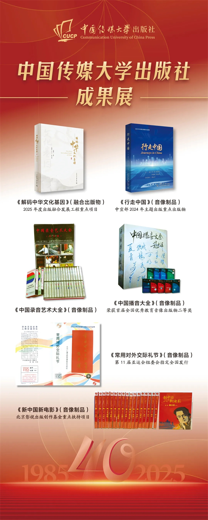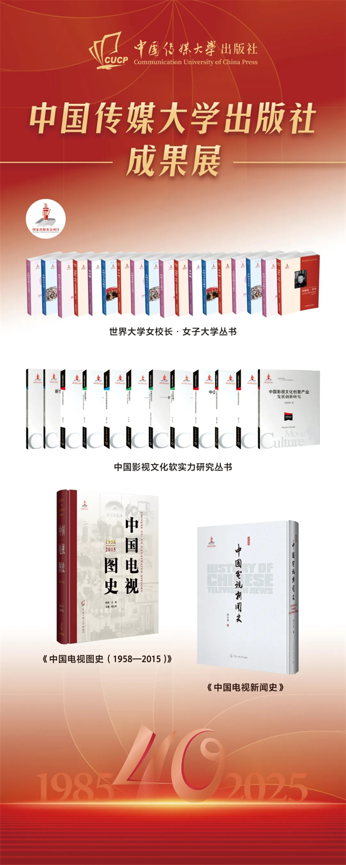 中国传媒大学出版社成果展在本次会议上同步展出。该成果展重点呈现了出版社自建社以来的核心出版成果,涵盖图书、音像制品、学术期刊及融合出版物等品类,系统梳理了出版社在推动学术传播与文化传承中所积淀的出版脉络,受到与会领导与专家的广泛关注与好评,彰显了出版社长期以来坚守品质、深耕内容的出版传统与时代贡献。