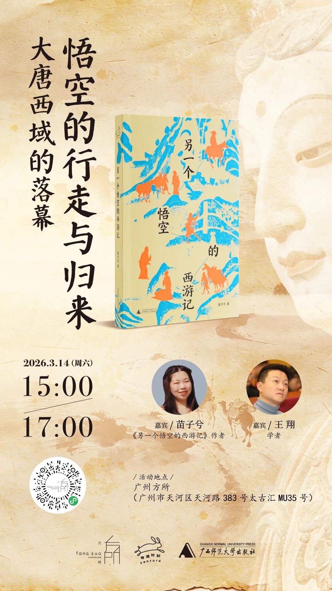 3月14日周六下午3点,《另一个悟空的西游记》作者苗子兮,将与青年学者王翔齐聚广州方所,带你循着真实悟空的脚步,一起聊聊历史与传说的交织,探寻大唐西域落幕的深层密码,看个人命运在时代洪流中挣扎、坚守与回响。