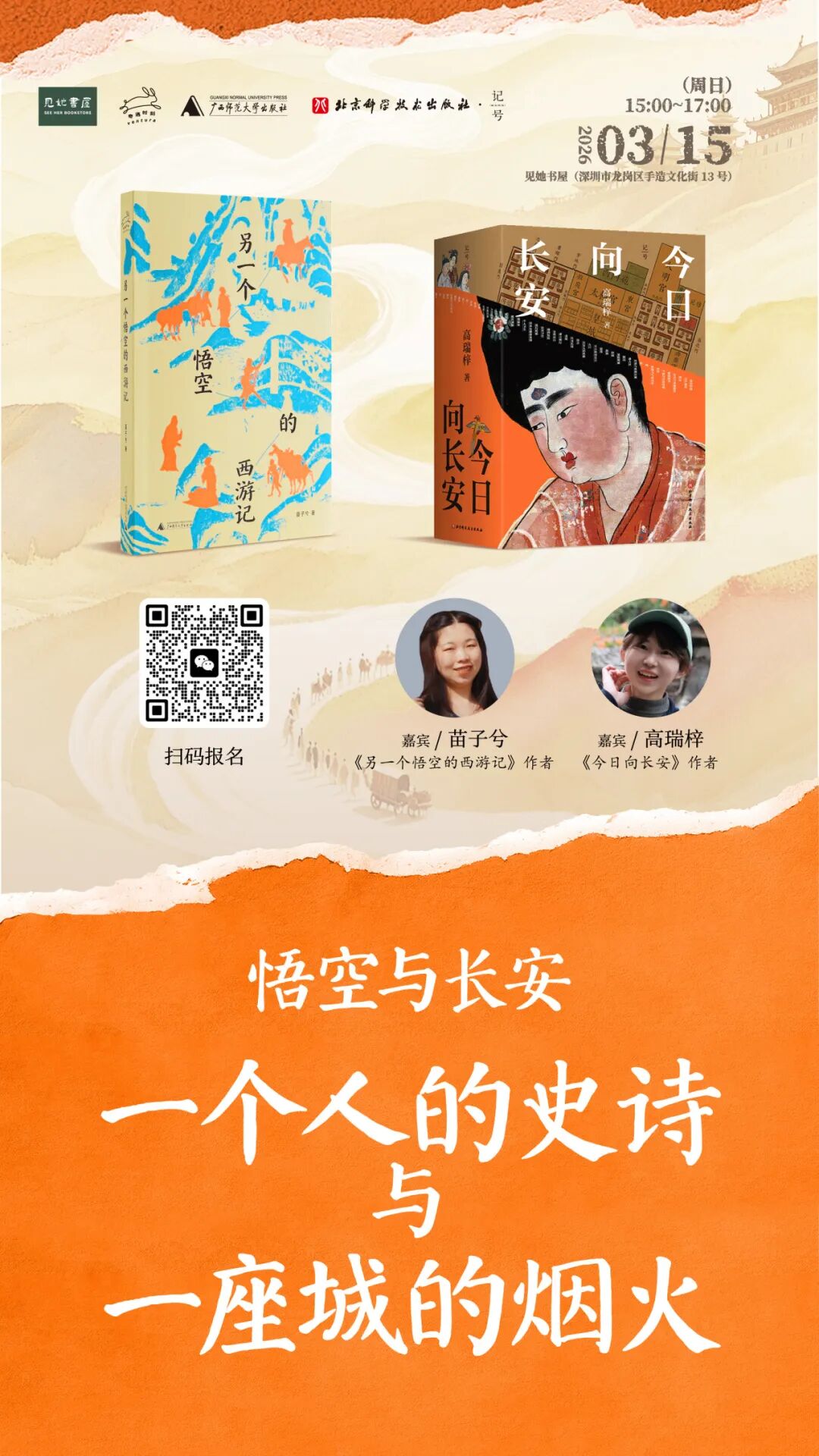 悟空与长安,是一座城的繁华大梦,也是一个人回乡的孤旅。3月15日周日下午3点,苗子兮、高瑞梓两位作家将齐聚见她书屋,带你循着悟空的步履,拆解唐人生活与个体命运的交织,一起观看在那段波澜壮阔的历史洪流中,一个人如何坚守,一座城如何永恒。