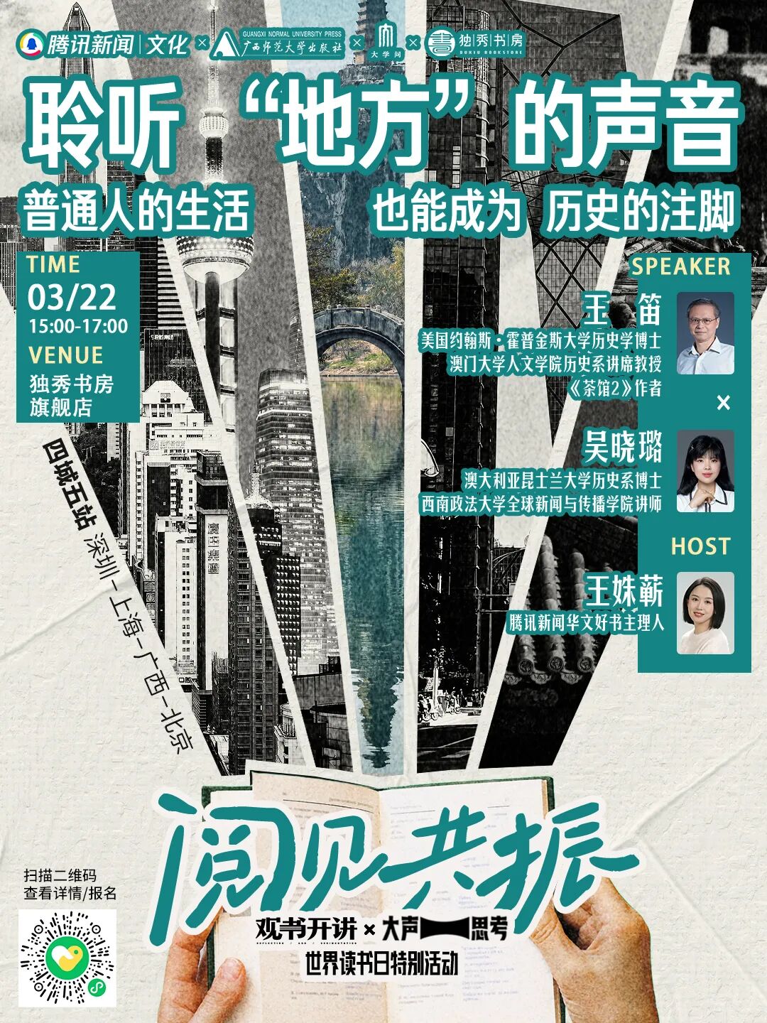 腾讯新闻文化观书开讲×大声思考启动《阅见共振》世界读书日特别活动,联合广西师范大学出版社·大学问、独秀书房,邀约澳门大学人文学院历史系讲席教授王笛、西南政法大学全球新闻与传播学院讲师吴晓璐、腾讯新闻华文好书主理人王姝蕲,聊聊如何聆听“地方”的声音。