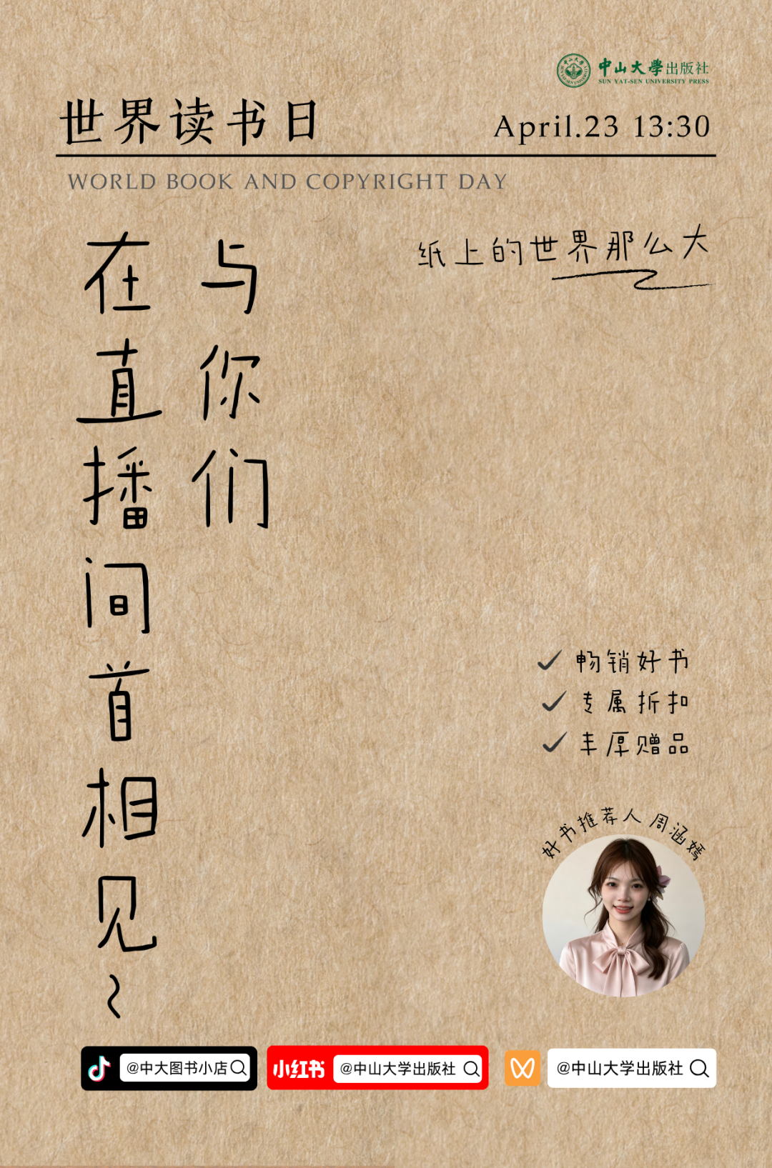 世界读书日,我们只做一件事:把阅读,送到你常去的地方。三平台同步,只为和你,安静相遇。4月23日,中山大学出版社首次开启抖音、视频号、小红书三平台同步直播。不刻意制造热闹,也不强调消费的紧迫。这场直播,更像一次安静的分享会:聊聊我们历年的畅销书,它们是经过市场和读者检验的作品,也是中山大学出版社多年来的心血沉淀。直播中会设置专属折扣与赠礼,这不是消费的噱头,只是我们对读者的一点心意。部分图书享专属优惠,更有实付满赠好礼:满58元赠2026年历或手绘地图,满98元赠帆布袋,满128元赠冰箱贴套装,这些礼物,是阅读之外的一点小纪念。