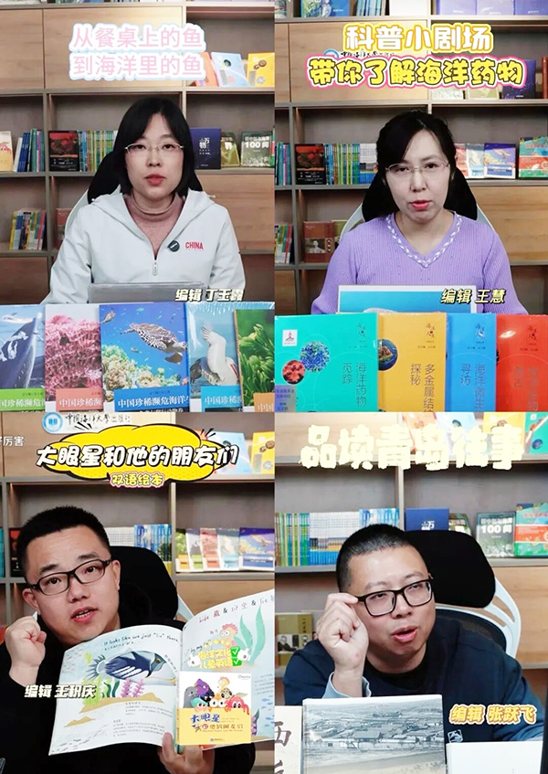 在深耕线下活动的同时,中国海洋大学出版社同步推进线上阅读推广工作,构建“线上+线下”双向联动的阅读推广格局。依托官方视频号,中国海洋大学出版社编辑王慧、王积庆、丁玉霞、张跃飞等骨干力量担任主讲人,精心推出“科普小剧场:带你了解海洋药物”“《大眼星和他的朋友们》专场”“年年有‘鱼’:餐桌上的鱼,海里的鱼” “品读青岛往事,邂逅山海人文”等系列直播活动。截至活动结束,系列直播累计观看近5000人次,点赞量超10万次,有效打破时空限制,扩大了科学普及与海洋文化传播的覆盖面,让更多群众足不出户就能享受优质阅读资源。